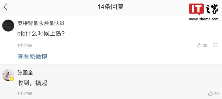 IT之家注意到,有用户向小米手机系统软件部总监张国全反馈,希望实现NFC刷卡上岛。对此张国全回复称“收到,搞起。”